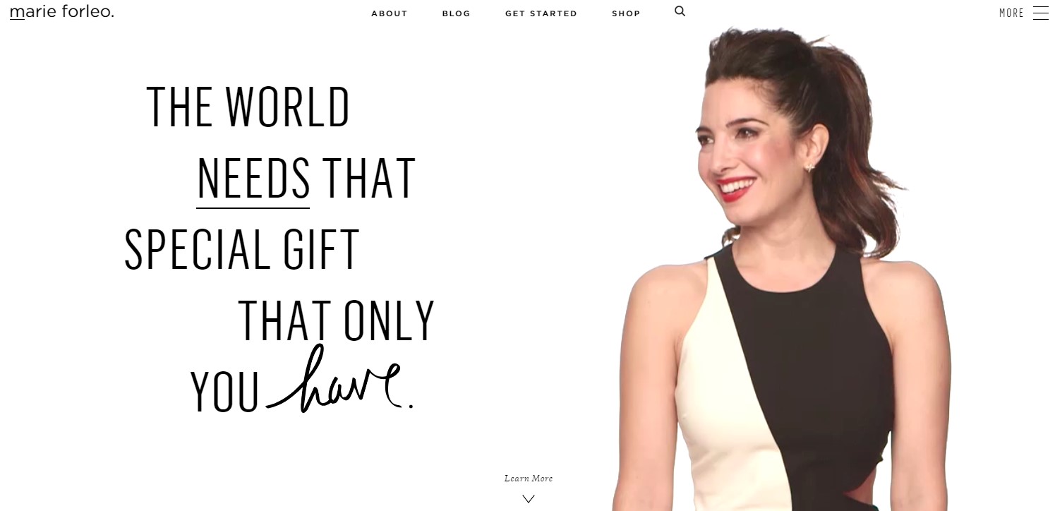 This is the top of Marie Forleo’s home page. When you go to marieforleo.com, she actual enters the screen in a floating video (which is likely an HTML5 rendering). This showcases that she is the person behind this business. It’s her personal brand, her personal enterprise.
